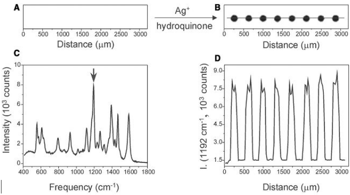 a, b银涂层表面增强前后的扫描示意图,c某个Ag spot处的拉曼光谱,d. 对应b图各点在1192cm-1处的拉曼强度分布