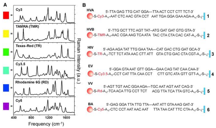 a六种染料标记的纳米颗粒探针在银涂层表面增强后的拉曼光谱,b 具有相应靶分析的六种DNA