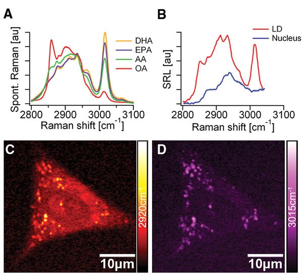 a. DHA, EPA, AA,OA的普通拉曼光谱,b. 脂滴(LD,红线)和细胞核内区域(蓝线)的SRL光谱,c. 2920cm-1处细胞的SRL图像,d. 3015cm-1处相同细胞的SRL图像。