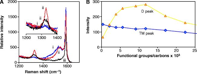 每1000个碳连接5.6个基团后,功能化使得碳纳米管的拉曼光谱发生显著改变,在比率为22.4之后,光谱信息能够明确区分开金属性和半导体性质的碳纳米管。拉曼光谱可以成功表征功能化单壁碳纳米管的电子结构
