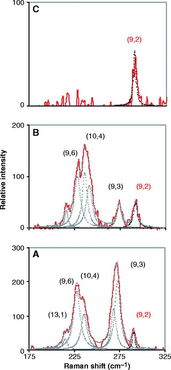 单壁碳纳米管制备的一大挑战就是操控其电子结构,已知的制备方法能够制备半导体,半金属和金属类型的碳纳米管。带隙荧光和拉曼光谱的光谱识别,能够极大地提高对分散在溶液相中的纳米管的不同电子结构的监测能力,明确其半导体、半金属和金属特性。