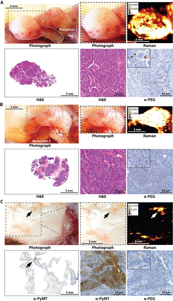 AB图是右上胸腺和右下胸腺中形成两个相邻的肿瘤,C图是沿着白色虚线切除肿瘤后切除床的光学图像和拉曼成像。未切除肿瘤时,抗PEG IHC染色显示肿瘤中存在SERRS纳米星,从拉曼成像中也能清晰直观的看到残留的肿瘤部分,与切除后PyMT染色显示的残留肿瘤位置形状等高度吻合。